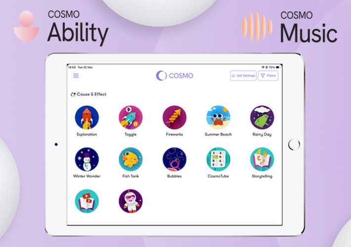Na prática, Cosmo é a combinação de hardware e software: um conjunto de 8 Cosmo Dots, dispositivos multissensoriais com conexão Bluetooth e feedback visual, auditivo e tátil, integrados a um aplicativo com diversos módulos de aprendizagem, desenvolvidos com base em evidências e oferecidos com licença vitalícia.