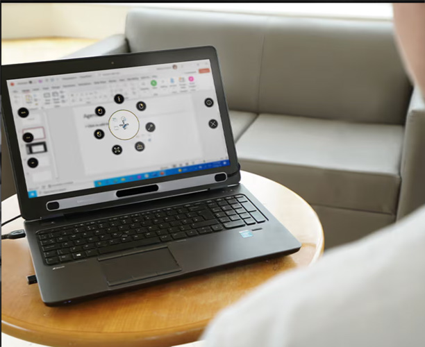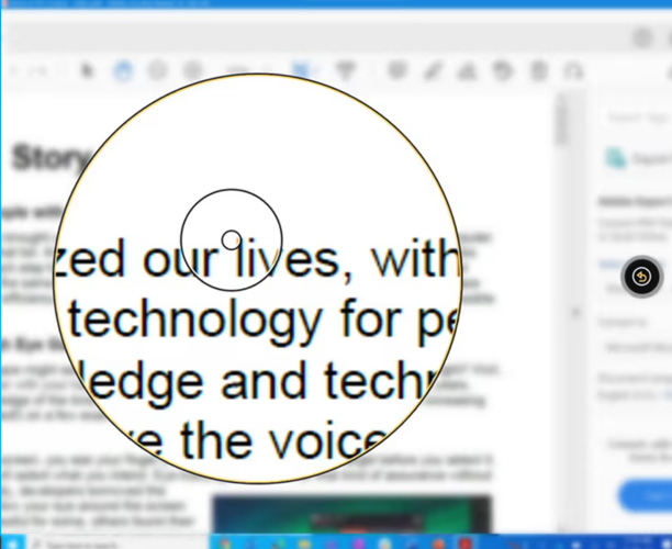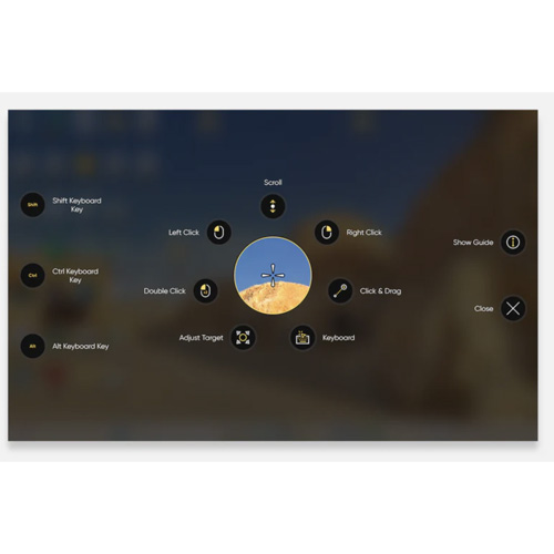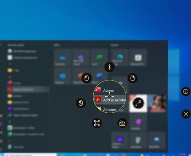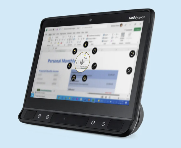 Navegue e controle seu ambiente Windows de maneira natural, minimizando a movimentação dos olhos, o que reduz a fadiga. Cada comando aparece em um botão circular em torno da interface central. Botões redondos e menus radiais facilitam a seleção e o foco na função desejada e minimizam seleções incorretas.